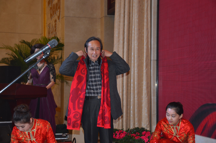 为山东省浙江商会会长章鹏飞先生及予会代表介绍作品“马”的创作感想。