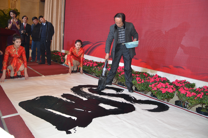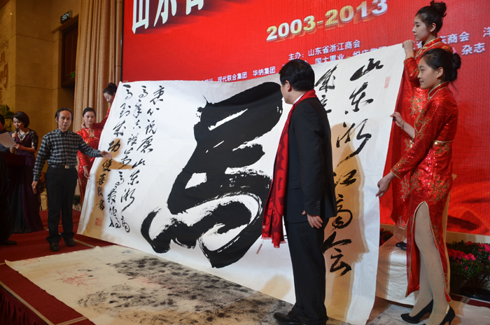 徐双喜应邀于2014年1月11日上午参加鲁浙知名书画家交流笔会,与鲁浙书画家进行了书画艺术交流。同日晚六点,又应邀在全国浙商华北峰会暨山东浙江商会成立十周年庆典晚宴上书写榜书“马”字,衷心祝贺全国浙商华北峰会隆重召开暨山东省浙江商会成立十周年,并祝大家:马年吉祥,马到成功!