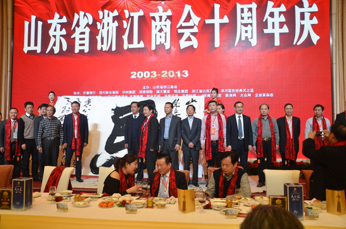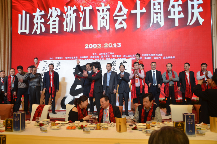 与浙江省经协办郑宪宏副主任、山东省浙江商会章鹏飞会长及常务副会长们在作品“马”字前合影留念。