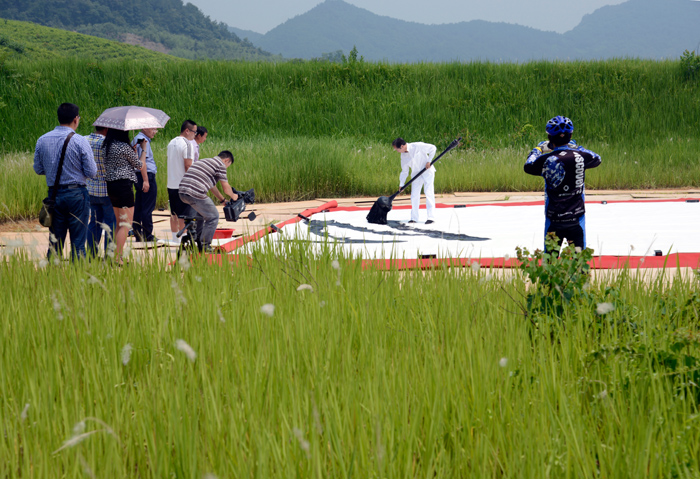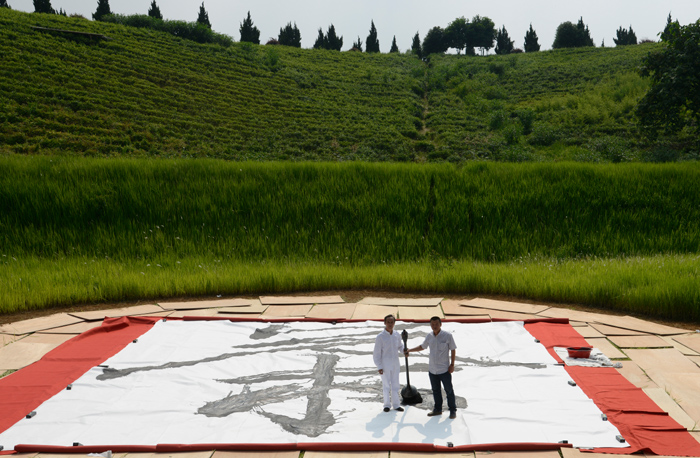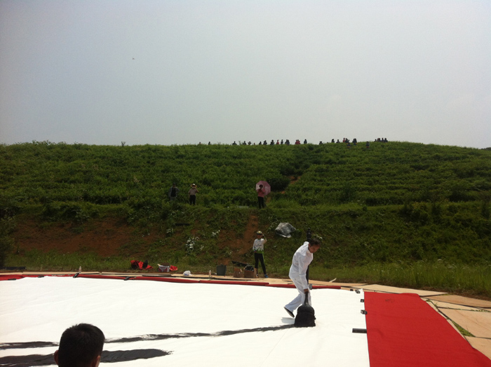 山底是一个一百多平方米的空坪,已铺好红地毯、宣纸等。被誉为“中国榜书第一人”的徐双喜先生身着白色唐装伫立在上面,较平日的温文尔雅更多了份飘逸、洒脱。在导演下达了“开始”的口令后,徐双喜轻松拿起近百斤的大毛笔,于天地之间,忘情地挥动手中巨椽,瞬间书写出一个100平米的“茶”字。有着茶树的姿态,又有着茶叶清韵的“茶”字似一树墨茶降临在人间,引得绍兴市电台的工作人员拍摄起来更加兴奋、激动,兴趣大发,航拍、摇臂全部出动,从各个角度进行了长时间拍摄。