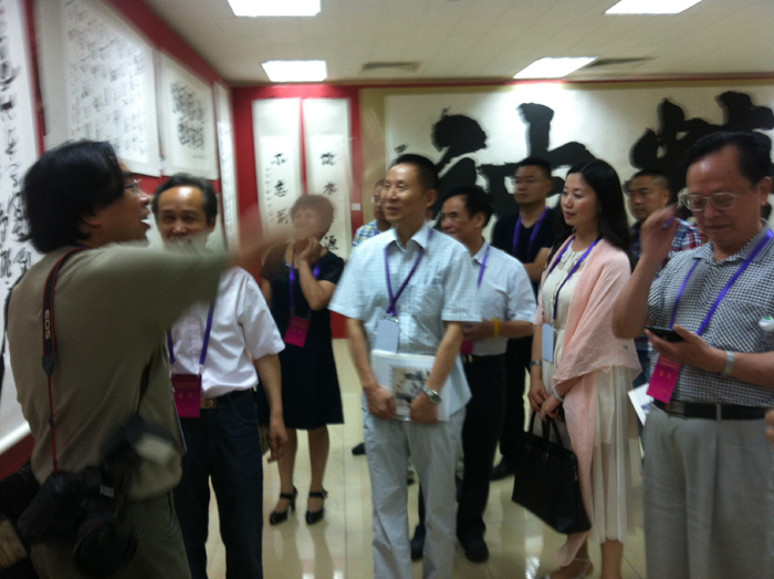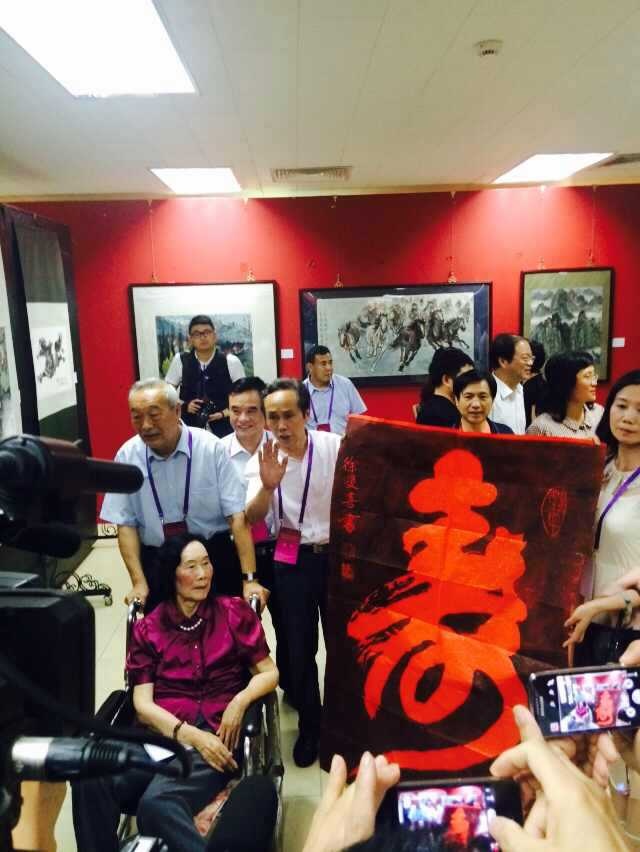 徐双喜先生作为中国著名的榜书书法家被主办方特聘为此次书展的艺术总监,并在活动期间展出了他精心创作的榜书作品“龙马精神”(10*2.8米)、鹅、艺(每幅2.4*1.2米)。他的作品大气磅礴、气势恢宏,得到了予会领导和嘉宾们的好评!开幕式上,廖静文女士愉快地接受了徐双喜作品“寿”(被刻于湖南省祁阳市青云寺庙内)拓片的赠送并表示了对徐双喜先生的感谢!