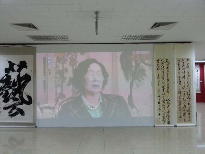 投影左边为徐双喜的单体榜书“艺”(尺寸:2.4*1.2米)。右边为中国书协理事、中国书协学术委员会副主任、北京大学书法艺术研究所所长王岳川先生作品。