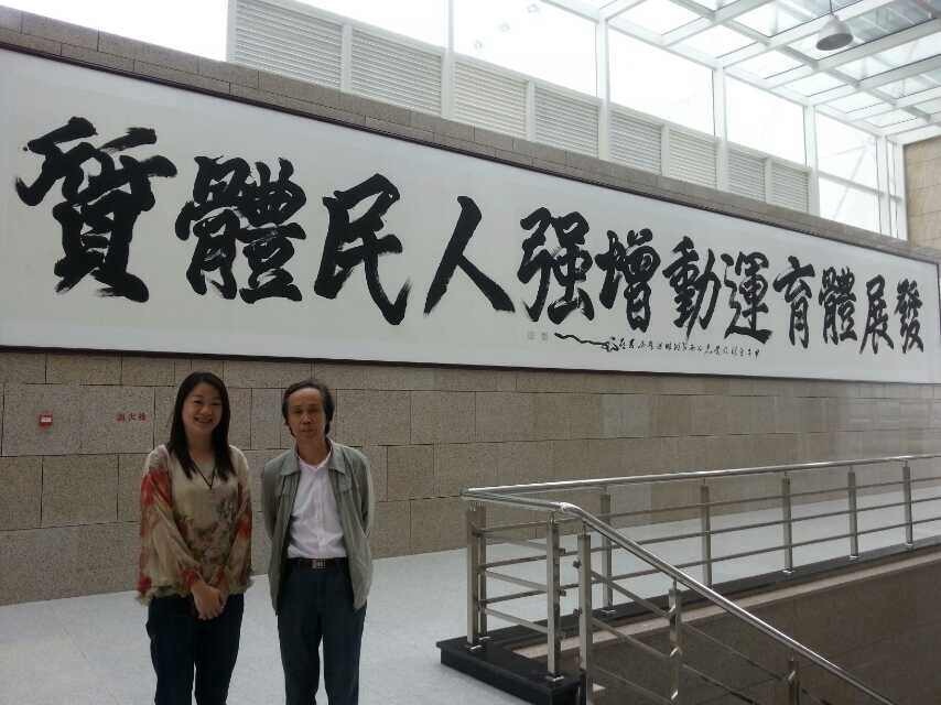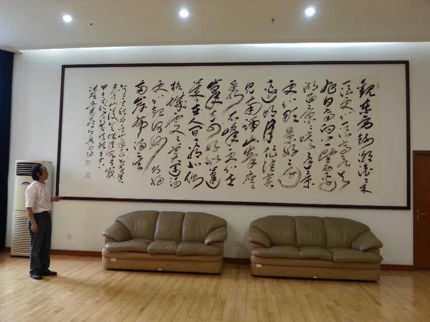 二O一四年十月十一日上午,浙江省黄龙体育中心综合健身活动部吕红部长兴致勃勃地陪同徐双喜老师观看了悬挂在中心网球馆和综合会议室的两幅巨作(原作规格:其中《发展体育运动、增强人民体质》为16.35米x2.15米、《登城隍阁》为5.45米x2.15米)并在作品前合影。这两幅作品为不久前徐老师应中心邀请即兴而创作。