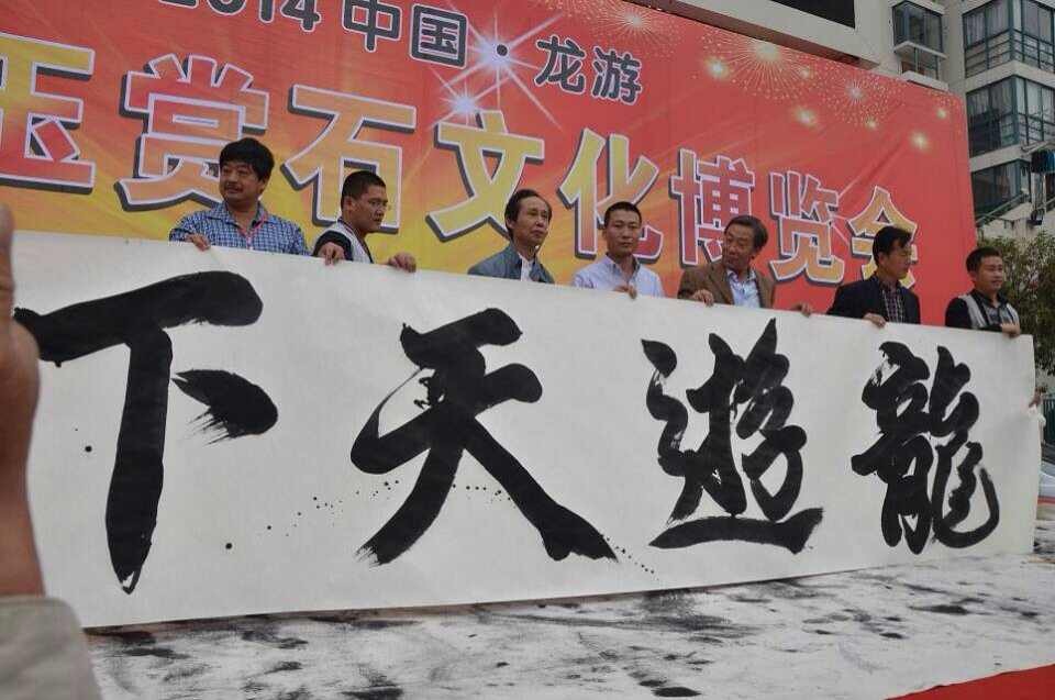 浙江省偃王文化研究会经浙江省人民政府批准成立,于10月18日借2014中国(龙游)黄龙玉赏石文化博览会开幕之际举行挂牌仪式,特别邀请徐双喜参加并表演榜书。徐老师在仪式上即兴创作"龍游天下"以表祝贺!