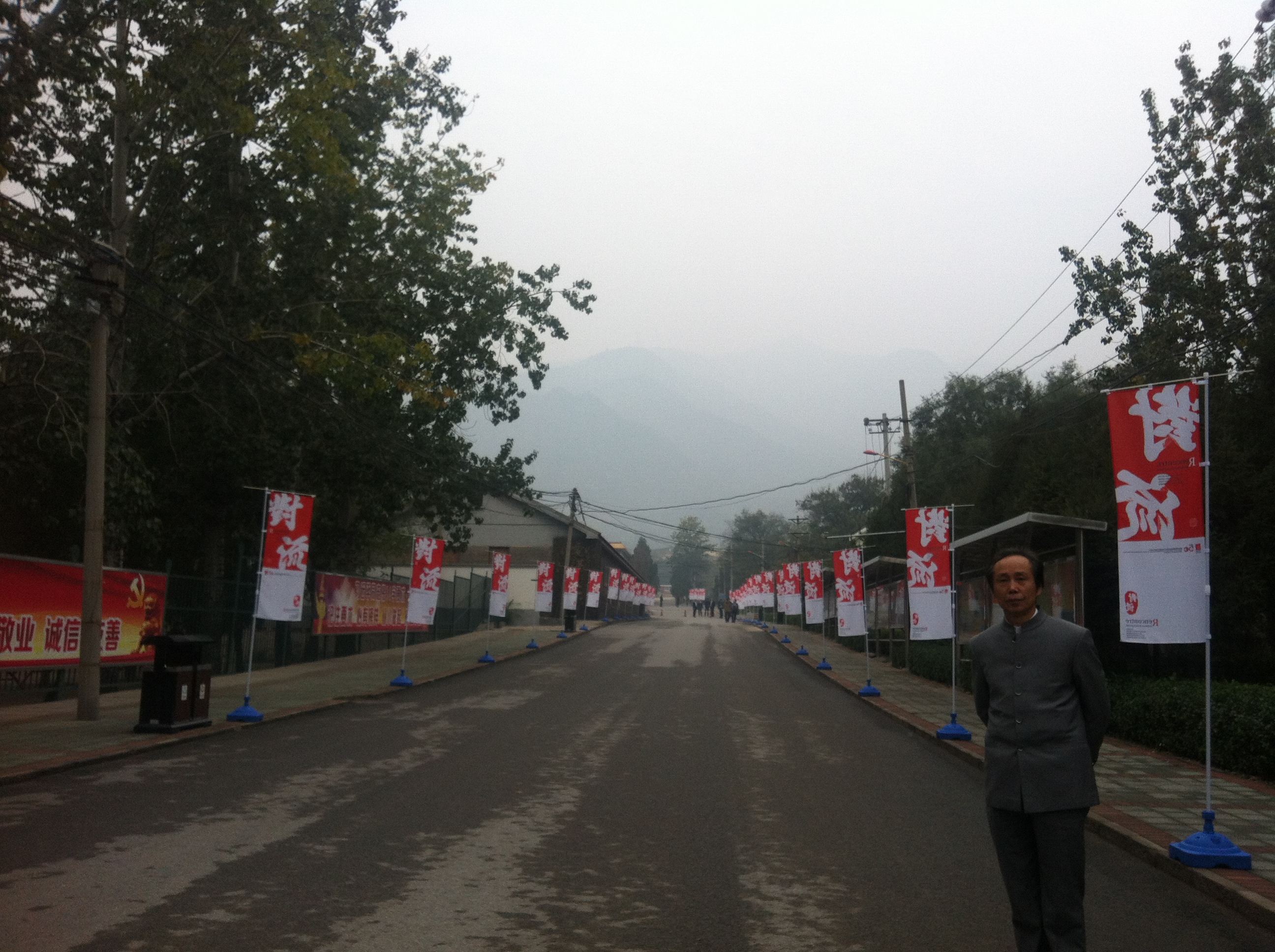马路两旁彩旗上印着徐双喜先生为本次活动题写的主题词“对流”。