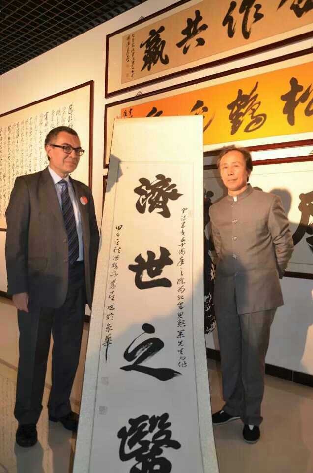 在中国著名翻译家李军先生的陪同下,让.路易.贝熙业兴致勃勃地参观了徐双喜书法展,并与徐双喜先生亲切地进行交流。