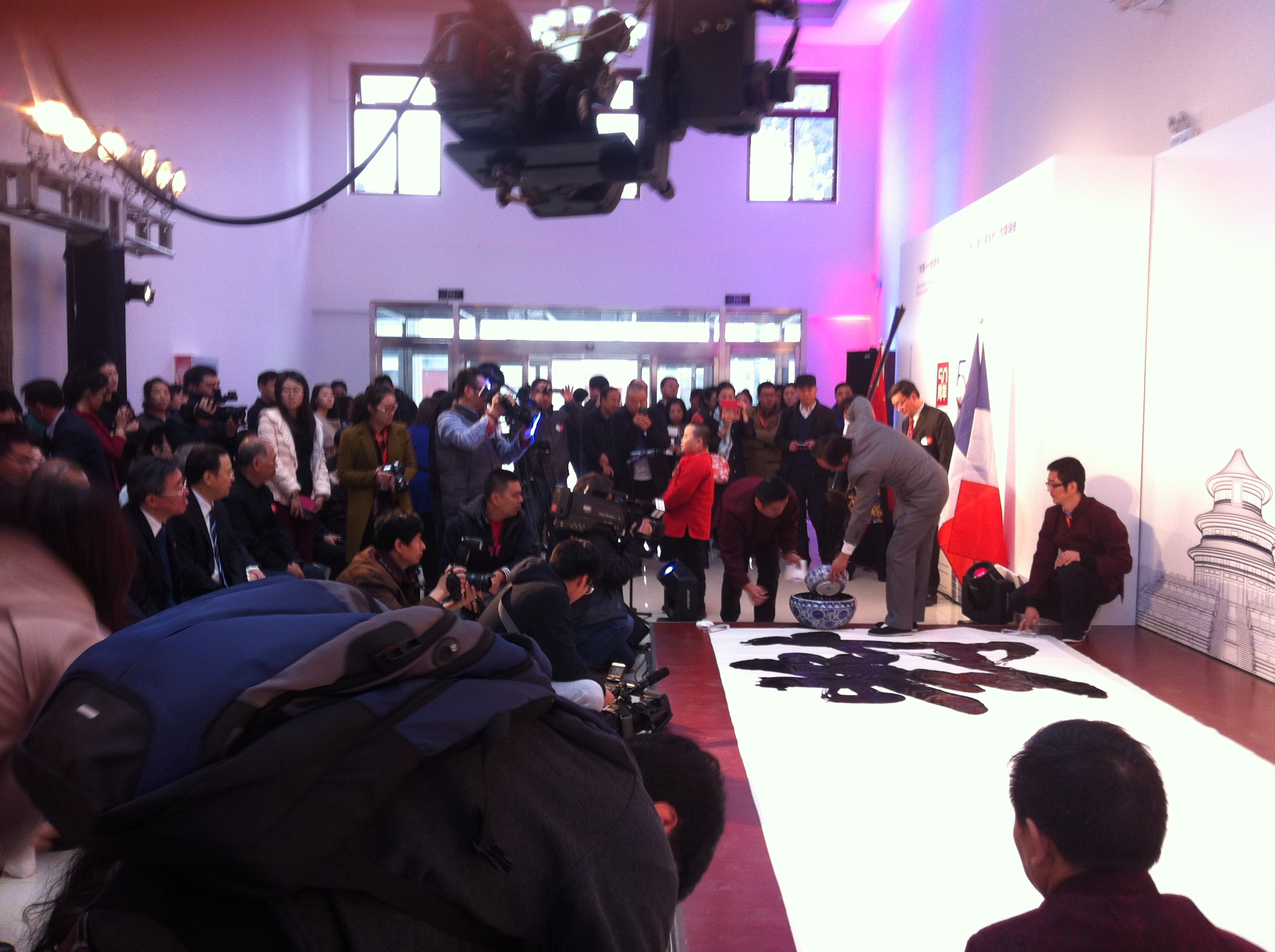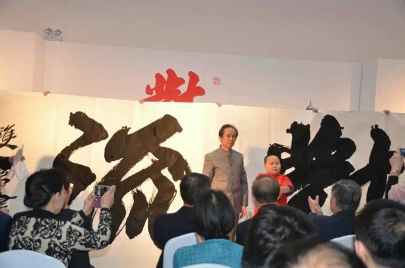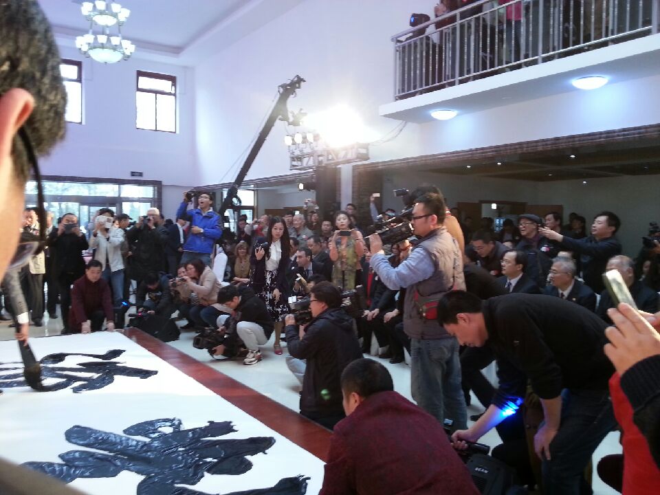 双喜先生现场书写”对流”时,全场领导和嘉宾被深深吸引住,一个个全神贯注地观看。 法国使馆文化教育合作参赞及让.路易.贝熙业(贝熙业之子)也立即拿起相机拍摄起来。