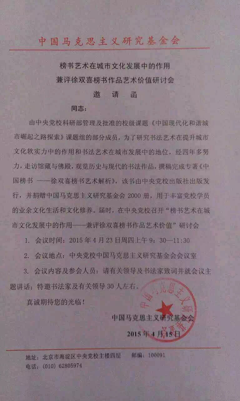 2015年4月23日上午9:30,“榜书艺术在城市文化发展中的作用兼评徐双喜榜书作品艺术价值研讨会”在中央党校会议室隆重召开!