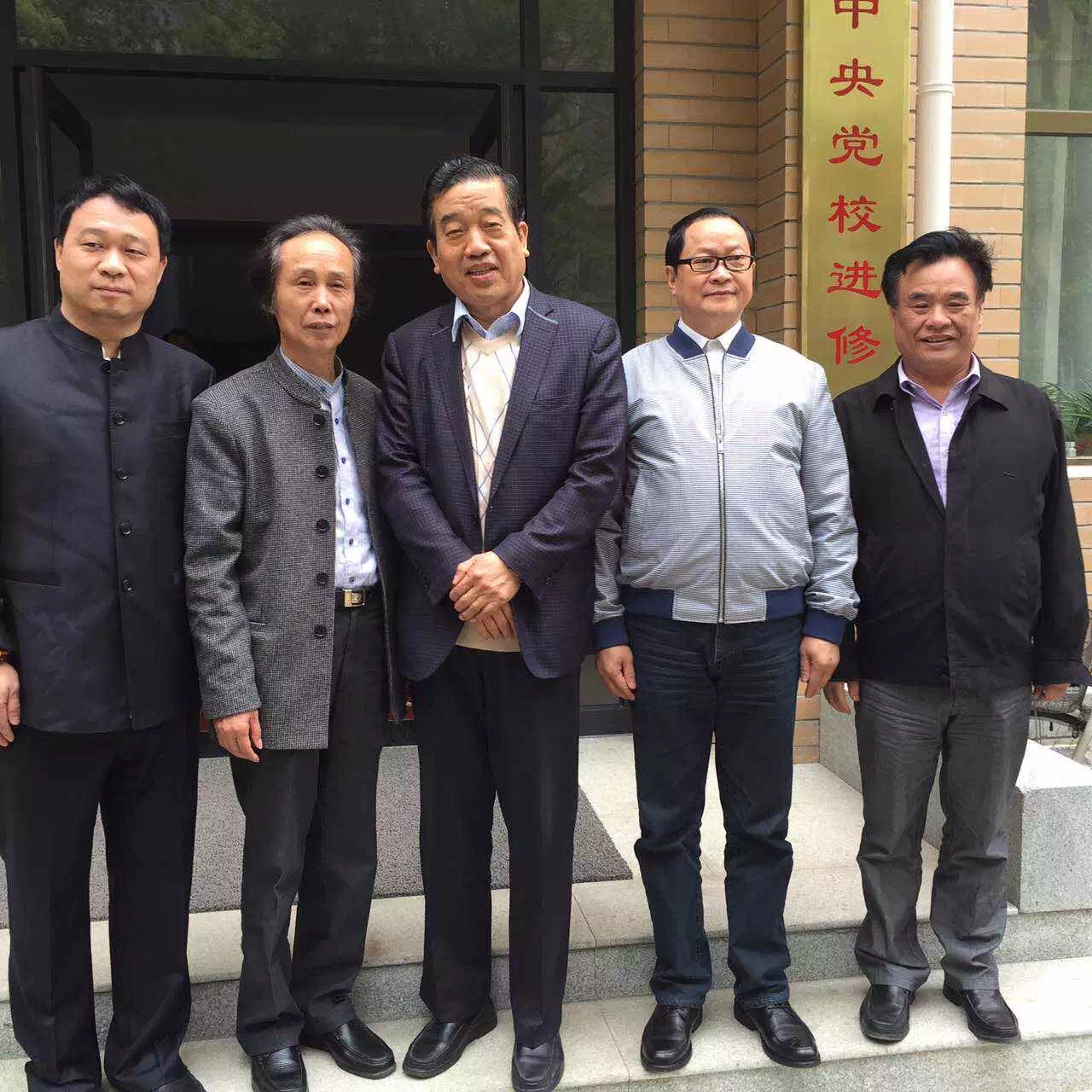 徐双喜(左二)与苏士澍(左三)、湖南省文联巡视员、中国书协理事何满宗(左四),江西省人大文教卫副主任、原江西省宗教管理局局长谢秀琦(左五)、北京大学书法艺术研究所名师精英班学员李皓(左一)合影留念。