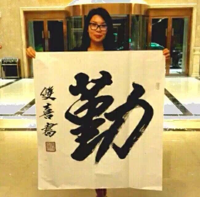 为井冈山红五星大酒店总经理俞妮娜女士书写“勤”字。