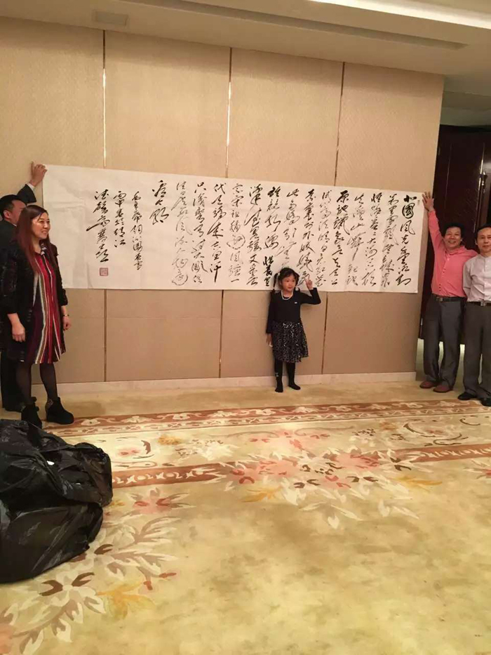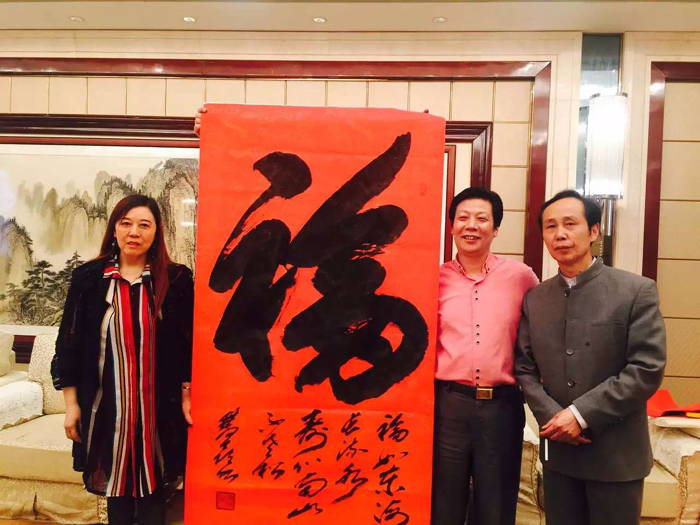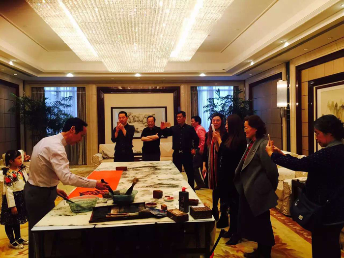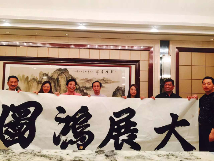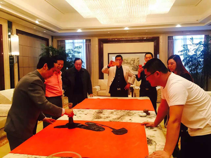 2016年4月28日,“中国榜书第一人”、著名书法家徐双喜在上海进行书法交流后又应江苏知名企业家徐灿国、王凤美夫妇的邀請,匆匆來到了江苏省靖江巿,受到隆重、盛情的款待。徐老师为他们酒店创作了丈二(3.65*1.4米)的“大展鸿图”,还有八尺(2.4*1.2米)的龙、虎、牛等作品。