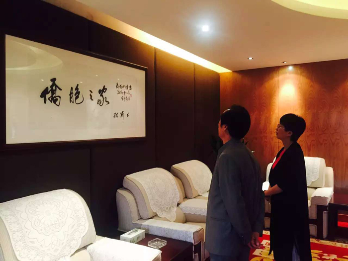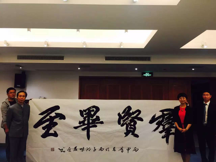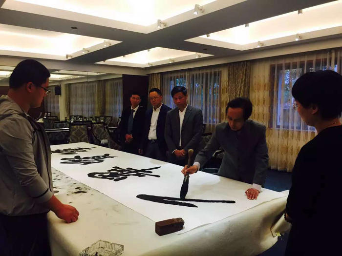 下午徐双喜老师又应杭州市侨联章燕主席的邀请,参观了杭州市侨联活动中心。参观完毕,徐老师为侨联工作人员签名贈送了中共中央党校课題组研究成果,中共中央党校出版社出版的《中国榜书—徐双喜榜书艺术解析》一书。最后为活动中心量身订制,创作了大幅榜书作品“侨之家”(尺寸:2.4*0.7米)、“群贤毕至”(3.65*1.5米)。看着这几幅大气磅礴,奕奕生辉的墨宝,章主席、丁佐委员和袁心洁主任非常激动。章主席说:“侨之家刻制成匾额,群贤毕至装修挂出之后,将为活动中心增光添彩,让侨胞们更能感受到伟大祖国光辉灿烂的文化和杭州市人民对侨胞们的浓浓情感!”