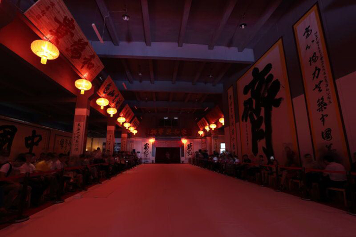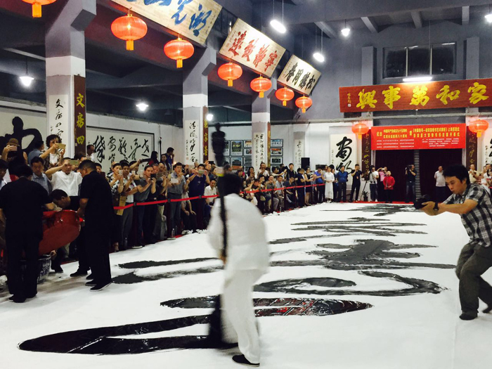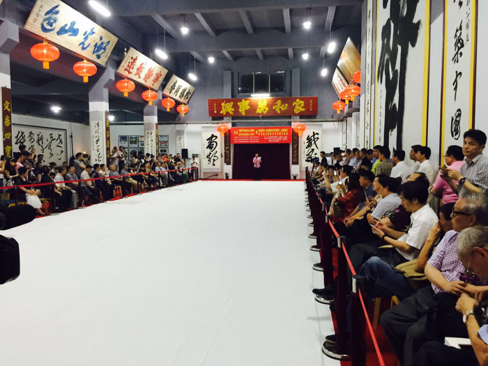 活动开始前半小时,展厅内采用烛光照明,并伴有琴、棋、书、画,闻香、品茗等表演,表演者身着中国传统服装,让参观者仿佛穿越时空,回归魏晋。开幕式宣布开始时,灯光骤然亮起,参观者仿佛置身于榜书艺术的神圣殿堂。四壁上的巨幅榜书作品“中国梦”、“福禄寿喜”浑厚大气,气韵生动。展厅中央悬挂的6.9米*4.3米硕大“齐”字更是大气磅礴,酣畅淋漓,大有五岳飞来动乾坤之势。高悬空中的大型木质匾额长廊古朴、典雅,让人耳目一新,宛如置身于老上海古街一般。徐双喜先生此次书写匾额时使用的笋壳笔、布团陈列在现场,让人大开眼界。展厅内还陈列了徐双喜先生的代表作品《临怀素自叙帖》、《爱心育子》等长篇巨制。展厅内精心摆放的兰花、瓷器、绍兴黄酒和大红灯笼,烘托出一种典雅高贵的艺术气氛,引起观众阵阵惊叹。