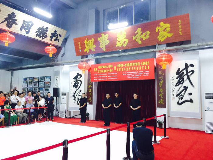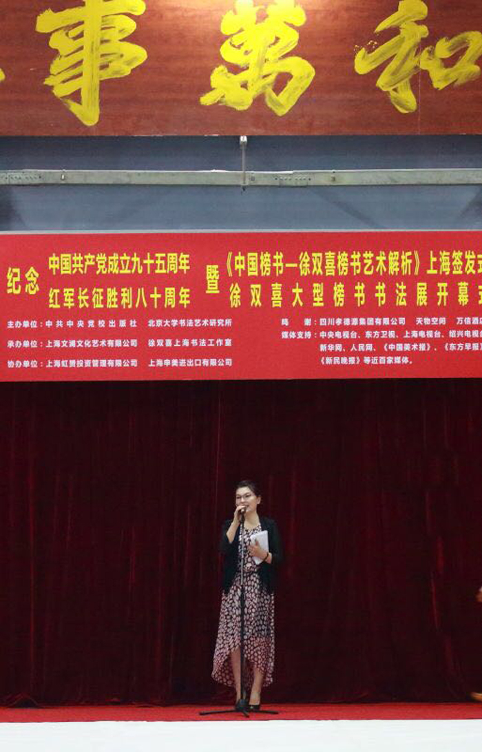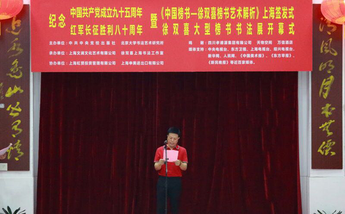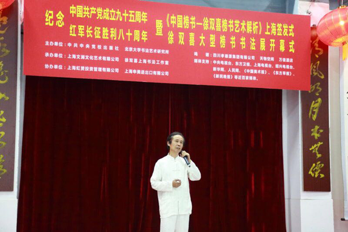 7月16日上午,纪念中国共产党成立九十五周年、红军长征胜利八十周年暨《中国榜书—徐双喜榜书艺术解析》上海签发式、徐双喜大型榜书书法展开幕式在上海浦东陆家嘴杨高中路2102号上海市文澜文化艺术中心隆重举行。此次活动由中共中央党校出版社、北京大学书法艺术研究所联合主办,上海文澜文化艺术有限公司和徐双喜上海书法工作室承办。中央电视台《新闻联播》著名主持人李瑞英和绍兴电视台著名主持人徐继承联袂主持了此次活动。