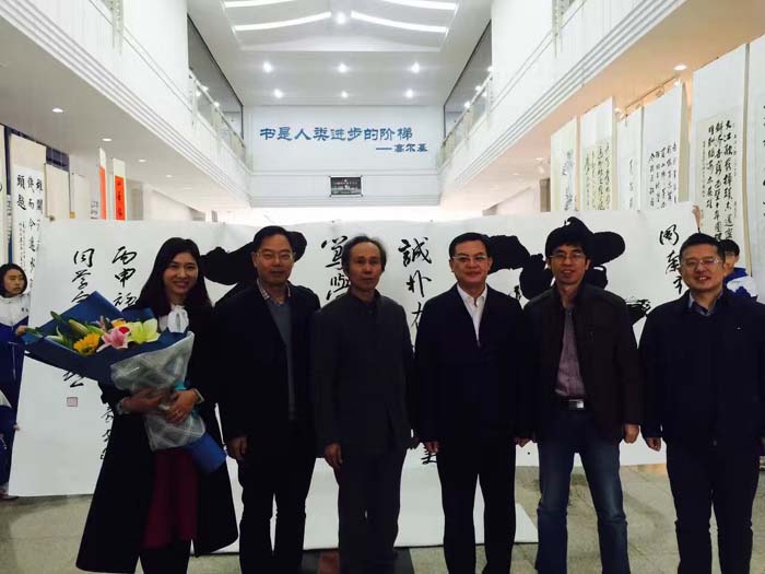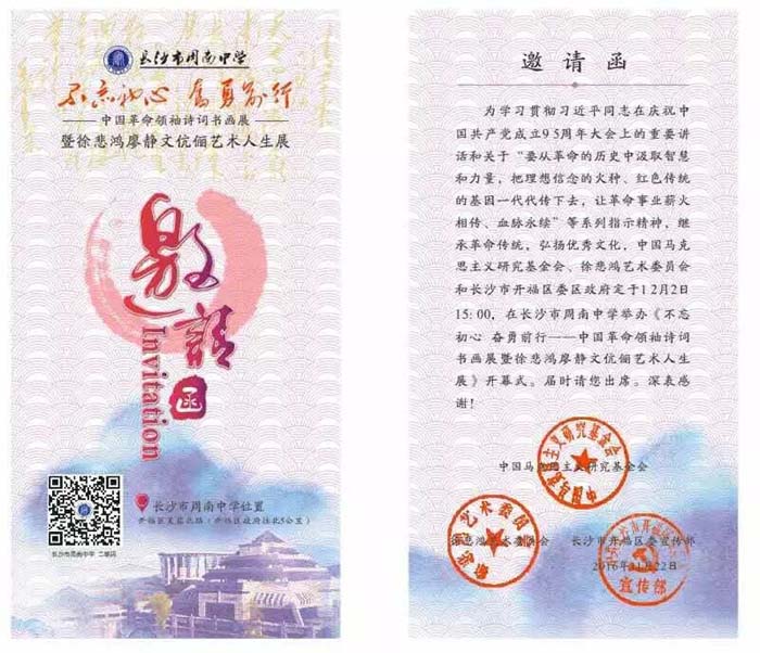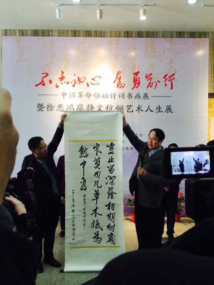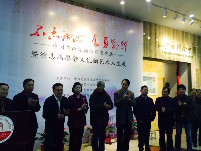 2016年12月2曰下午3:00,风和日丽,宾朋满堂。“不忘初心,奋勇前行—中国革命领袖诗词书画展暨徐悲鸿伉俪艺术人生”开幕式在长沙市开福区廖靜文先生母校—周南中学剑凡图书馆隆重举行!此次活动由中央党校马克思主义研究基金会、徐悲鸿艺术委员会、长沙巿开福区委宣传部联合主办!