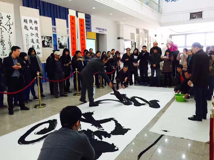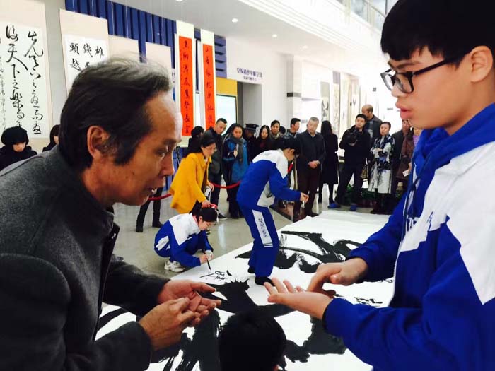 本次活动的艺术总监、著名书法家徐双喜先生应邀在开幕式上挥毫泼墨,笔走龙蛇,现场榜书创作了“腾飞” 两个浓墨重彩、气势磅礴的大字(尺寸:5·45*2.15米)贈送给周南中学。徐老师写完“腾飞”二字后,周南中学四位书法爱好者还在“腾”与“飞”之间用毛笔书写了“诚朴、健美、笃实、奋进”八字周南校训,他们的小字与徐老师的大字组成一幅美妙的图画,相得益彰!