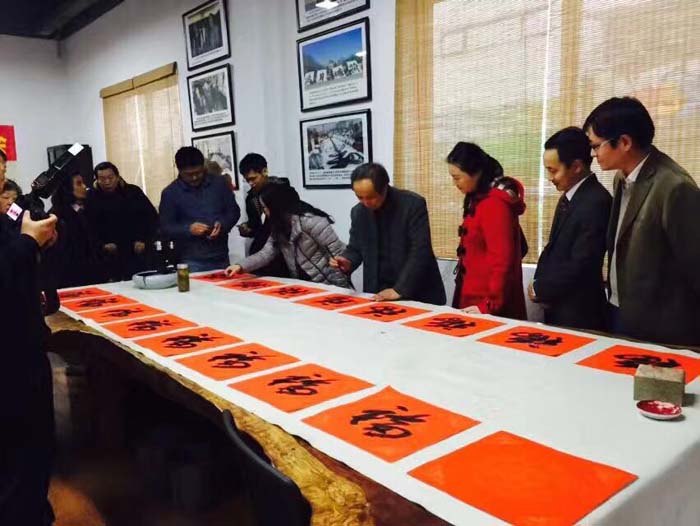 在徐双喜先生助手的陪同、解说下,予会代表们首先集体参观、仔细欣赏了馆内展示的全部书法作品。然后观看了徐双喜老师个人书法专题片。会议结束时,徐老师应邀为联谊会题写了会名,并现场为每个俞氏宗亲书写、赠送了“福”字,以表达自己作为东道主及俞家外甥(徐老师母亲姓俞)对各位贵宾的新年祝福!