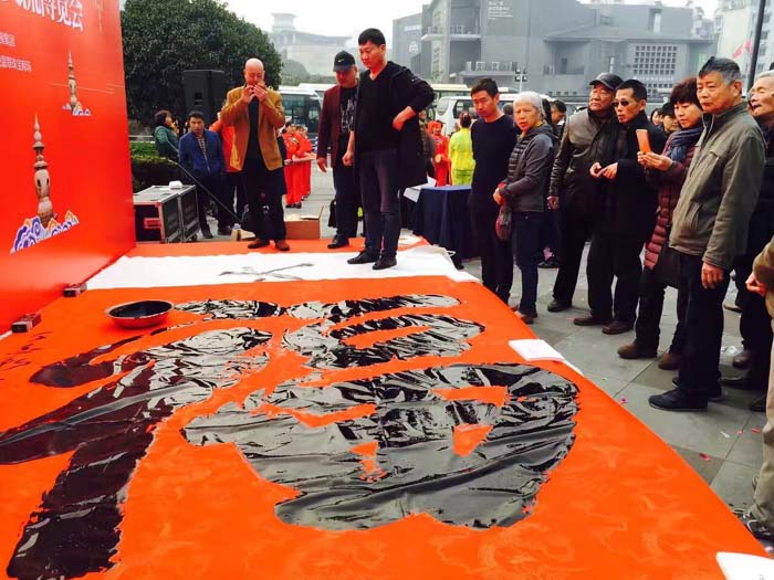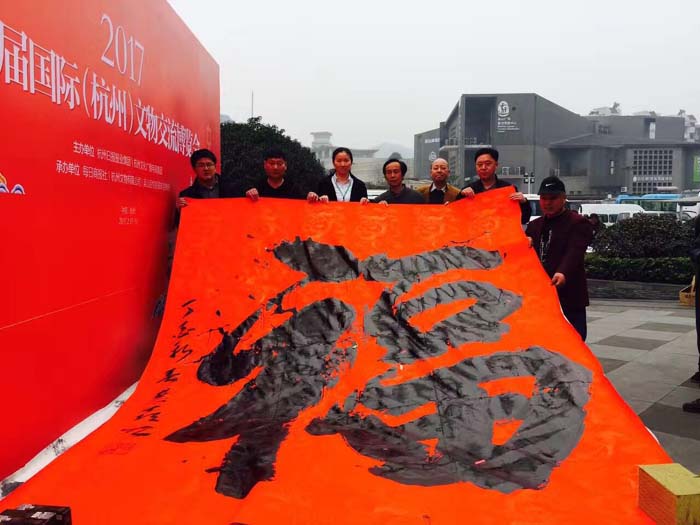 “中国榜书第一人”、著名书法家徐双喜应邀出席了“2017年第二届国际(杭州)文物交流博览会”开幕式,并在活动现场挥毫泼墨榜书书写了16平方米饱满厚重、喜气洋洋的大“福”字,赠送给此次活动的组办单位之一—杭州文物协会。