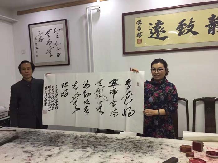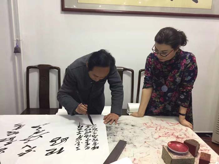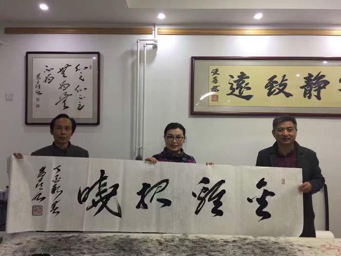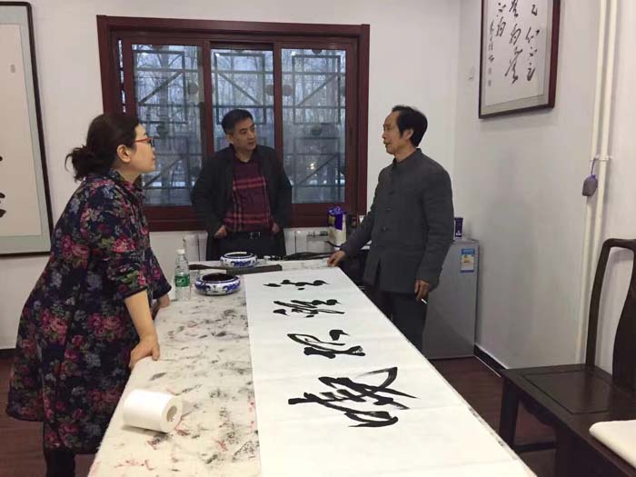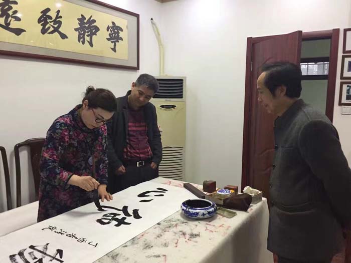 2月21日下午,中央电视台《新闻联播》著名节目主持人李瑞英、中央电视台《翰墨戏韵》栏目编导楼建军等贵客来到了著名书法家、“中国榜书第一人”徐双喜老师北京书法工作室作客。大家就共同感兴趣的书法等话题进行了长时间热烈的讨论,还就书法技艺等方面进行现场切磋与交流,并相互赠送了作品。由于巧逢当天下午下起了大雪,徐双喜老师还即兴为李瑞英老师送上了两句"李花将开,瑞雪满天飘;英姿勃发,春光无限好!"给这次聚会增添了乐趣!