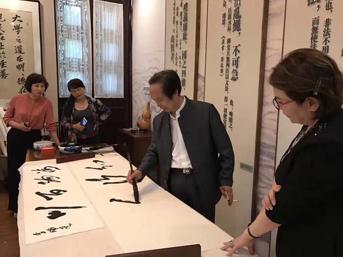大家先一起仔细参观、欣赏了馆内艺术长廊和国学堂内展示的徐双喜先生的20多幅书法精品。然后与徐双喜老师就书法理论、书写技巧、审美趋向等有关方面进行了广泛的讨论和交流。与此同时,大家还兴致勃勃地挥毫泼墨,一展风采!
