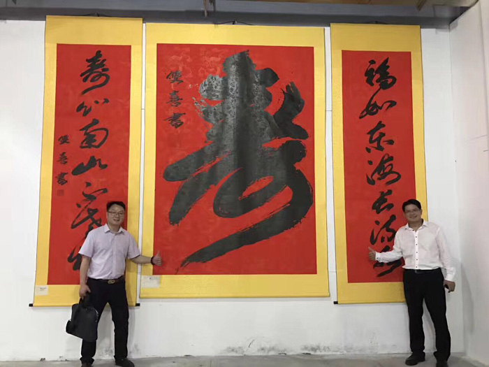 上海财经大学硕士研究生导师龙陈教授(右一)与汉庭酒店杨志明董事长(左一)在徐双喜先生作品前合影留念。