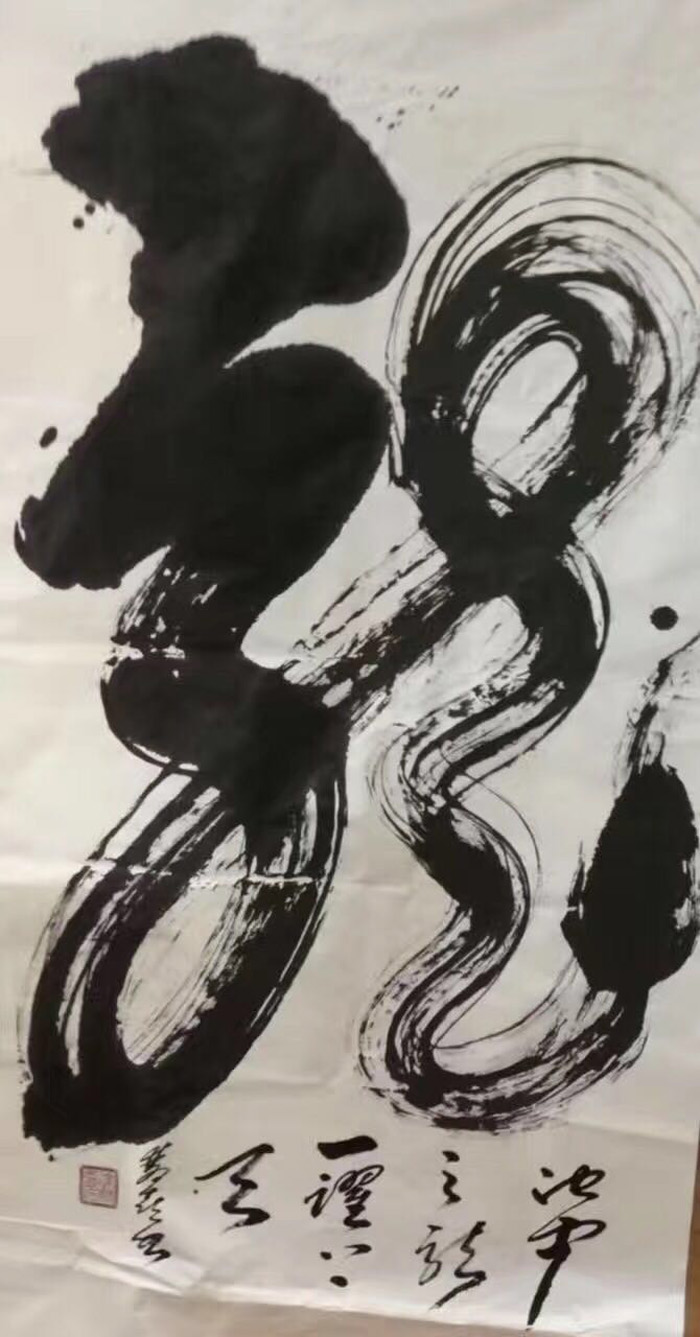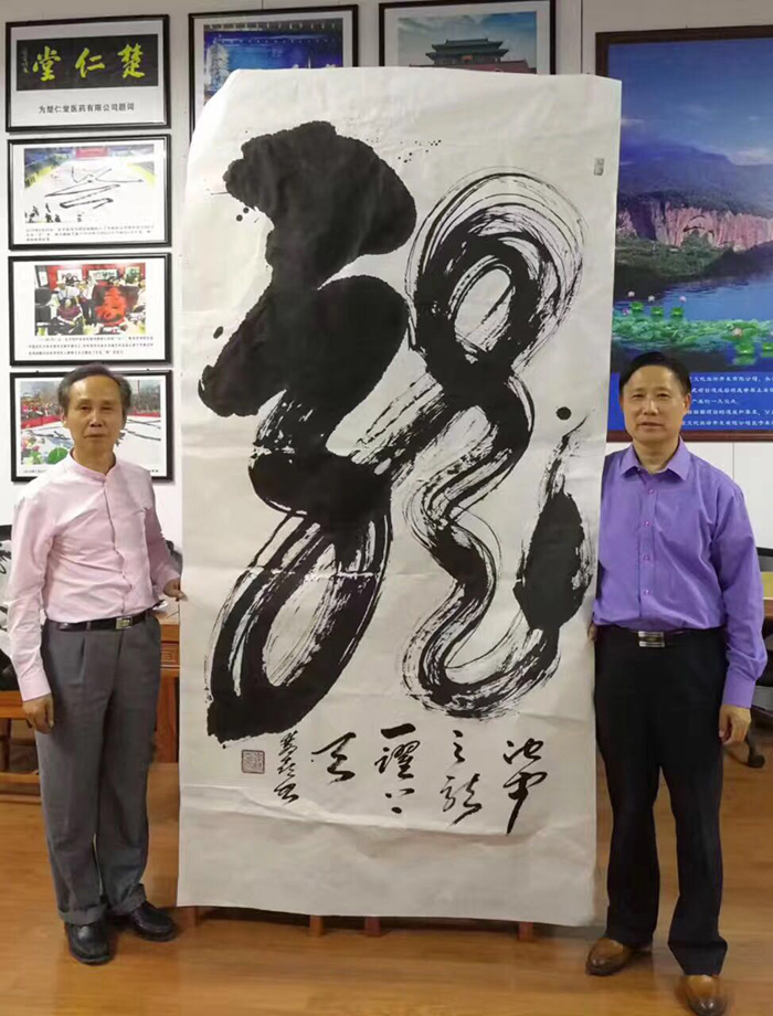 徐双喜老师与张恭春秘书长在“龙”字前合影。