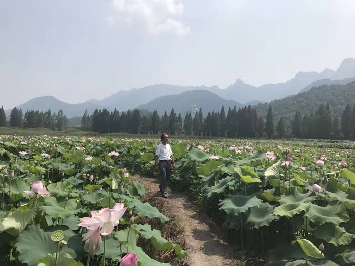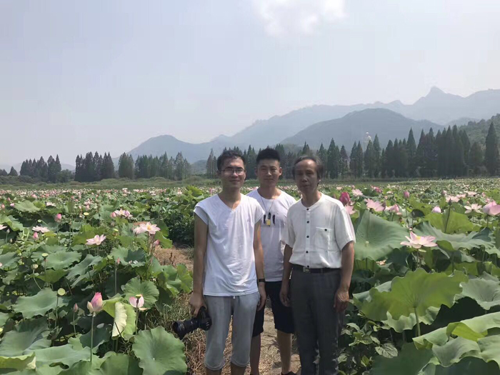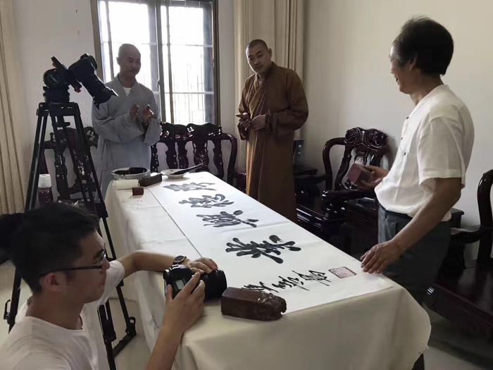 此时的九华山山脚荷花盛开,一望无垠;山上晴岚流翠,美景连连,让人心旷神怡,自在逍遥。在明月、广籼两位法师的陪同下,摄制组先后拍下了徐老师题写的拜经台、望华禅寺、财神殿三块匾额。这三块匾额纯铜浇制,表层镀金,做工考究、精致,为雄奇秀美的九华山增添了浓浓的文化气息。应广籼法师之请,徐老师还现场挥毫泼墨,为即将建成的五百罗汉堂题词。