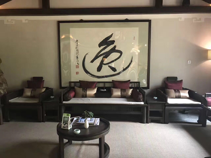 2017年7月28日,摄制组来到了杭州。见到西西湿地公园碧云轩大堂悬挂的“逸”时,翟老师的眼睛瞬间便被锁住了,然后半小时内跟我们聊的话题都是这幅作品。说此字真是写神了,不但每条线条美得不可方物,更是写出了逸的内涵,使人见之便生出闲逸、舒适之感。会所工作人员说很多客人看到这幅作品也是赞不绝口,留连忘返。