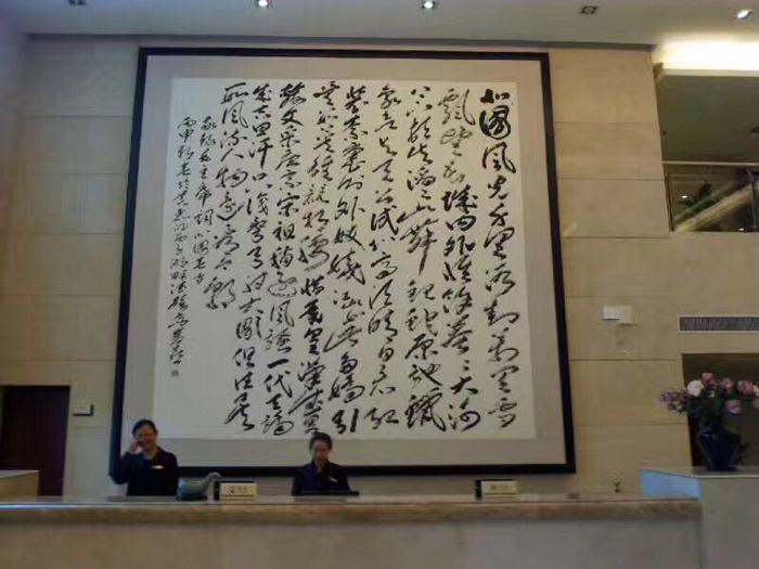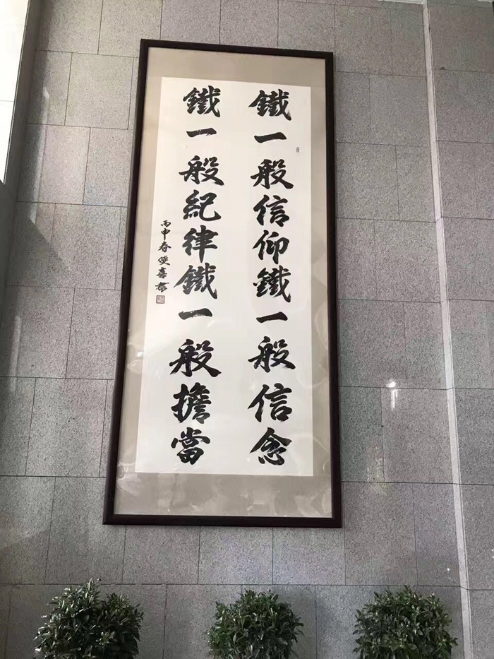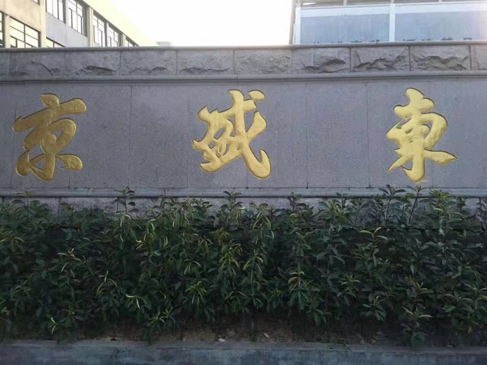 拍完杭州市委党校、杭州新州宾馆里悬挂的徐老师作品后,我们来到了绍兴东盛京公司,这是一家大型生产户外运动服装的企业。因为经常维护,几年前徐老师题写的“东盛京”三字依然金碧辉煌,煯煯生辉,神釆斐然。