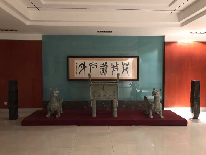 公司老板是一对王姓亲兄弟,待人和蔼可亲,平易近人。听说徐老师前来,早在大门口恭侯。两位王总爱好书画、古董的收藏,非常有思想。在东盛京公司,我们见到了很多从未见过的古董,大开眼界。也见到了徐老师受王总嘱托而写的“种云得禅”等作品。细心的小王总听说我们去沈阳,便说沈阳那边太冷,我给你们每人送一套厂里生产的户外运动衣服吧。衣服穿上身后,每个人大小刚好合适,样式也很时尚、美观,这份雪中送炭之情怕是大伙终身都难以忘记。谢谢两位王总,祝福你们生意兴隆,融通四海,万祥云集!