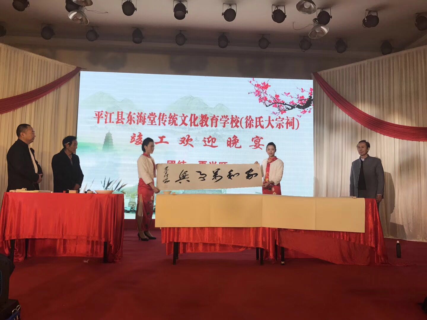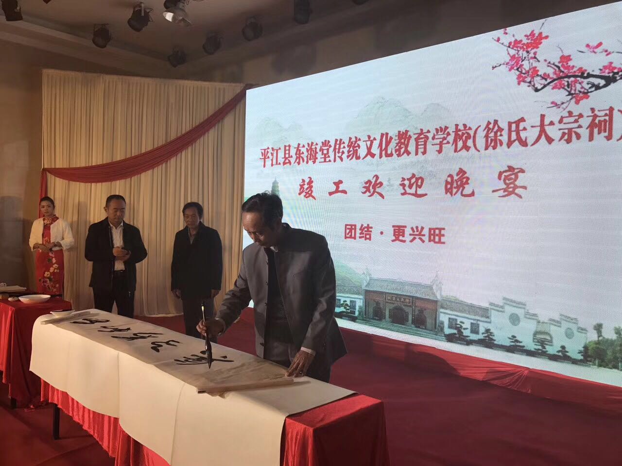 2017年10月21日上午九点,著名书法家徐双喜应邀赴湖南省平江县参加平江东海堂传统文化教育学校(徐氏大宗祠)隆重的竣工仪式,并为其成立的诗词联协会揭牌。还应邀在欢迎晚宴上挥毫泼墨,现场书写书法作品赠送给徐氏大宗祠。徐氏大宗祠内悬挂的“聚贤堂”、墙上的“德、孝、礼、乐”等皆为徐双喜老师的题词。