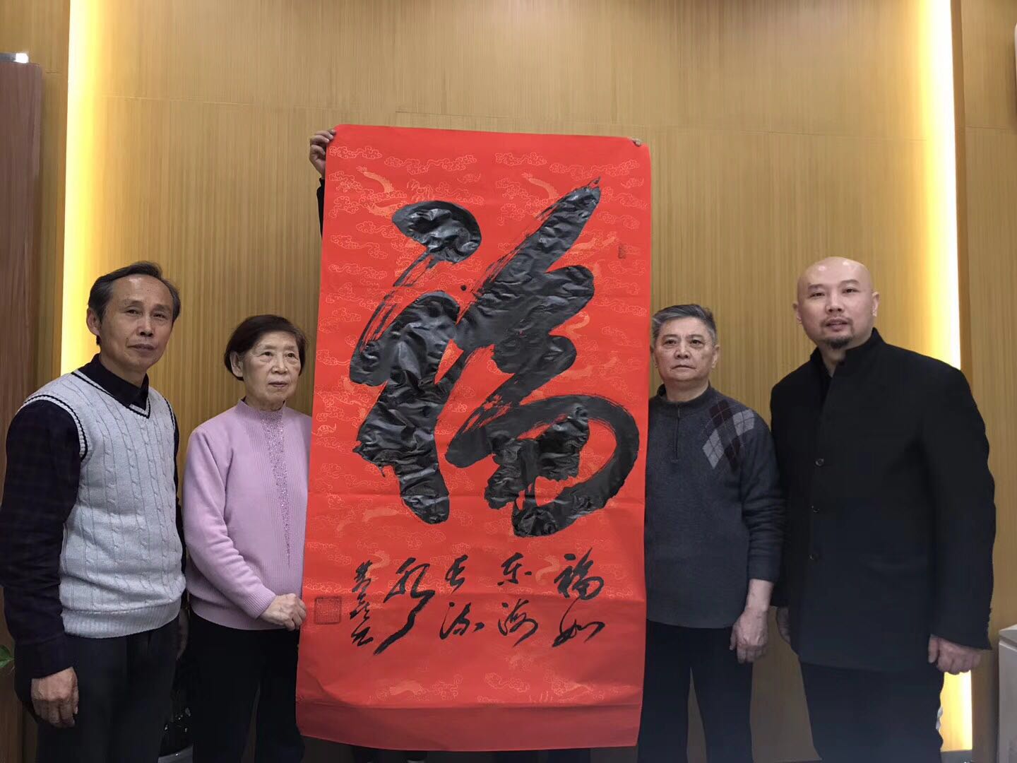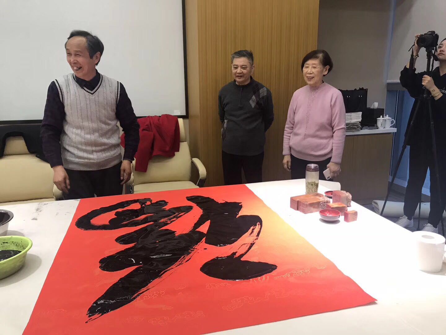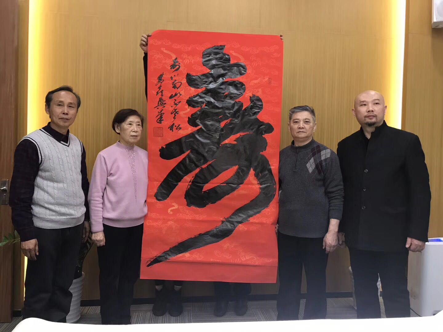 经邦集团薛中行董事長,为中国股权激励第一人、中国证监会登记结算股权激励课题组组长、资深投资银行专家。薛董事长精神瞿烁的高龄双亲也被接来观看笔会。气度不凡、正襟危坐的薛爸薛妈看了徐老师一气呵成、行云流水写好的六尺整张大“福”、大“寿”(尺寸:1.8*0.9米)后,不约而同地站立起来,在两字旁仔细观看、品赏,脸上绽放出惊喜、赞许的笑容。把大“寿”抬走时,薛妈妈亲自跟在旁边看护着,看到工作人员小心翼翼地放在铺好红色灯蕊绒的大桌上才安心离去。