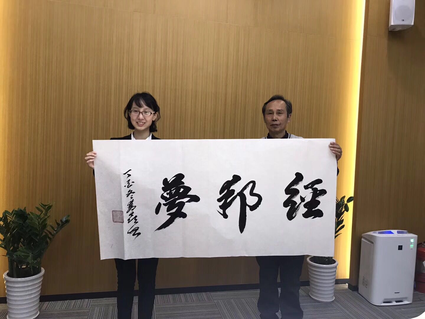 徐老师气势磅礴、潇洒稳健的榜书淋漓尽致地书出了薛董事长心中的豪情壮志和经融寡头的雄强风釆。让端庄稳重的薛董事长笑容变得越来越灿烂,话语也越来越活跃。